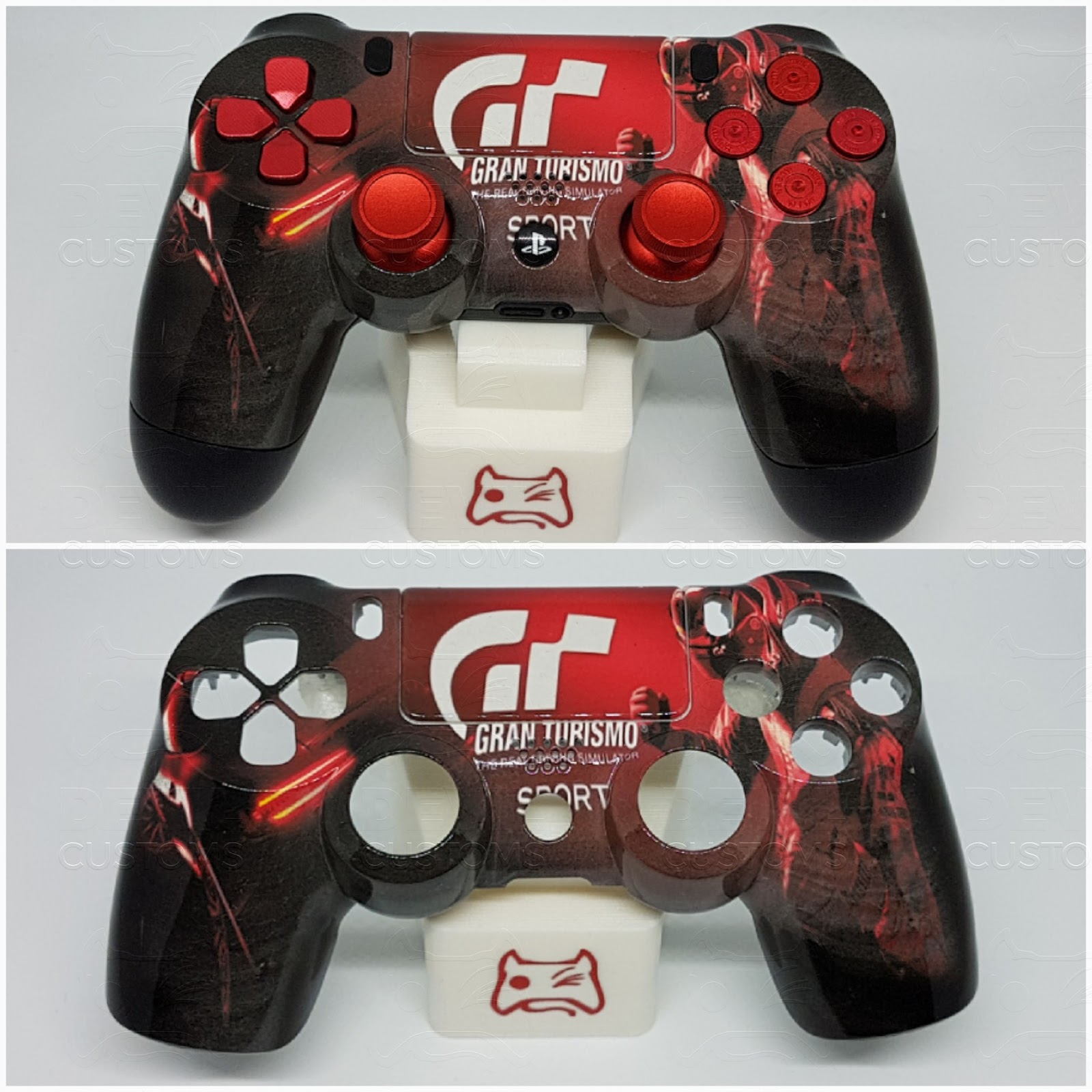 Dieser Playstation 4 Controller wurde nach der Grundierung in Weiß lackiert und anschließend mittels Wassertransferdruck mit der selbst hergestellten "Gran Turismo" - Folie überzogen. Zum Schluss wurde der Controller noch dreimal via Klarlack versiegelt. Die Tasten wurden gegen ein rotes Aluminium Set mit Bullets getauscht.