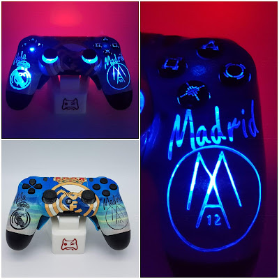 Dieser Playstation 4 Controller wurde nach der Grundierung in Weiß lackiert und anschließend mittels Wassertransferdruck mit der selbst hergestellten "Madrid" - Folie überzogen. Die Schriftzüge und Logos wurden frei gelassen und mit LED's beleuchtet. Zum Schluss wurde der Controller noch dreimal via Klarlack versiegelt. Die Tasten und Thumbsticks wurden gegen ein transparentes Set getauscht und ebenso mit LED's beleuchtet. Die Rückseite wurde mit Paddles ausgestattet (ähnlich Scuf - Tastenbelegung X und O).